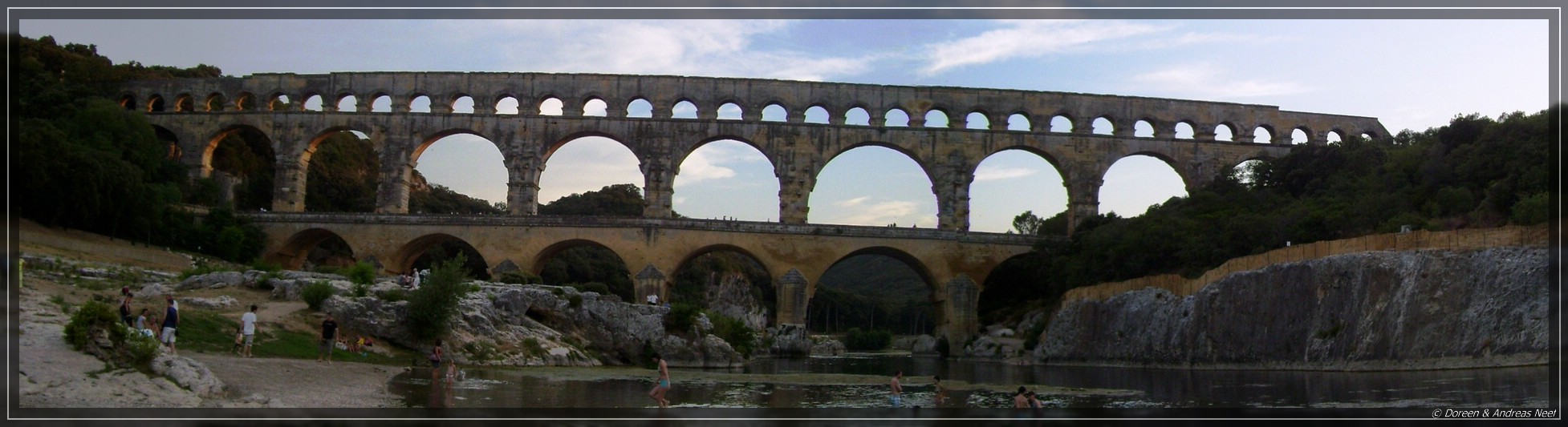 Immerhin hatte Andreas noch Gelegenheit, einen Geocache in der Nähe zu finden, bevor wir unsere Fahrt fortsetzten. Wir machten noch einen Stopp an der Chocolaterie Bernard Castelain, von der wir kürzlich einen Flyer entdeckt hatten. Das ganze entpuppte sich jedoch eher als große Verkaufshalle lokaler Produkte und war letztlich kein Highlight. Die hausgemachten Schokoladenkreationen, wovon es pro Person ein Stück gratis gab, waren hoffnungslos überteuert und die Weine, Oliven und anderen Produkte konnte man bei den nicht weit entfernten Erzeugern günstiger bekommen. Daher fuhren wir ohne längeren Aufenthalt weiter nach Avignon, passierten die Stadt im Süden und überqerten anschließend die Rhône in Richtung Nîmes. Den Hinweisen zum Pont du Gard folgend erreichten wir bald den Campingplatz La Sousta, der nur etwa 15 Gehminuten von dem berühmten römischen Aquädukt entfernt lag. Nachdem wir uns auf unserem Stellplatz eingerichtet hatten, gingen wir zunächst zum Schwimmen in den Pool. Danach machten wir uns auf den Weg zum Pont du Gard, wo wir im Licht der letzten Sonnenstrahlen eintrafen.