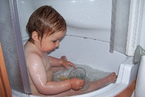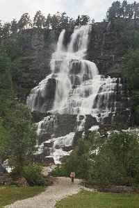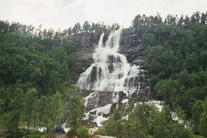 Da vom Wetter her keine Besserung zu erwarten war, kauften wir im SPAR-Markt rasch noch ein paar Zutaten für das Mittagessen ein und liefen zurück zum Wohnmobil. Während Doreen Essen kochte, ging Andreas mit den Kindern zum See. Besonders Lisa hatte unglaublichen Spaß daran, Steine ins Wasser zu werfen. Nach dem Essen kochten wir noch einen Kaffee, räumten dann alles zusammen und gegen 15:30 Uhr wollten wir wieder aufbrechen. Allerdings war die Ausfahrt auf einmal mit einer abgeschlossenen Kette versperrt. Die war bei unserer Rückkehr zum Wohnmobil ganz sicher noch nicht da und erst wenige Minuten vor uns waren auch andere Fahrzeuge wieder vom Platz gefahren. Da weit und breit niemand zu sehen war, gab es nur zwei Möglichkeiten für uns: An der nahe gelegenen Tankstelle zu fragen oder aber die Kette über die daneben befindliche Wiese zu umfahren. Wir entschieden uns für Letzteres. Doreens Bedenken, dass der Hang recht steil sei und wir mit dem Heck aufsitzen könnten, zerstreute Andreas mit dem Hinweis auf den hügeligen Zeltplatz in Byglandsfjord; da wären wir einen ähnlich steilen Hang problemlos hinunter und wieder rauf gefahren. Also nahmen wir kurz Anlauf, umkurvten die Kette über das auf dem Rasen aufgezeichnete Fußballfeld und fuhren dann über den Bürgersteig zurück auf die Straße. Gut, dass unser Wohnmobil so „handlich“ war… Wir verließen Voss nach Norden und während Lisa sofort in ihrem Sitz einschlief, schaute Vincent „Findet Nemo“ von DVD. Am Tvindefossen machten wir einen kurzen Fotostopp, anschließend fuhren wir weiter auf der E16 nach Gudvangen.