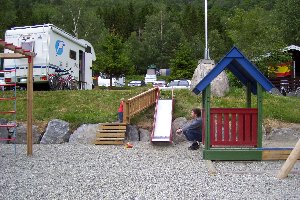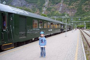 Der Check-in auf dem Zeltplatz war sehr freundlich und entgegenkommend. Wir bekamen eine Menge Tipps zu Unternehmungen im Flåmtal, der Fährfahrt durch den Naerøyfjord und Besichtigungsmöglichkeiten am Jostedalsbreen. Da wir uns noch nicht entschieden hatten, ob wir eine oder mehrere Nächte hier bleiben wollten, gaben wir einfach unsere Camping Card ab und konnten das Bezahlen auf den Abfahrtstag verschieben. Ein Mitarbeiter fuhr dann mit dem Fahrrad voraus und schlug uns einen schönen Stellplatz vor, direkt gegenüber dem Spielplatz, da wir ja mit Kindern unterwegs waren, mit schönem Blick auf das Tal und die Trasse der Flåmbahn. Vincent traf hier Karl, seinen Spielfreund vom Saebø-Camping in Eidfjord, wieder. Die Kinder verschwanden umgehend auf dem Spielplatz, während wir uns häuslich einrichteten. Das schlechte Wetter hatten wir hinter uns gelassen (wahrscheinlich hat es sich nicht durch den langen Tunnel getraut) und so kurbelten wir die Markise heraus, bauten Tisch und Stühle auf und schnallten die Fahrräder vom Träger ab. Nachdem wir Lisa und Vincent mit Mühe vom Spielplatz losgeeist hatten, radelten wir zum Bahnhof und besorgten die Tickets für die Fahrt nach Myrdal morgen 11:00 Uhr. An der Rezeption des Zeltplatzes hatte man uns ermutigt, das gesamte Tal mit dem Fahrrad zurück zu fahren und unsere Bedenken gegenüber den steilen Serpentinen im obersten Teil zerstreut, notfalls könnten wir die Räder dort schieben. Ursprünglich wollten wir die gesamte Strecke hinauf und den Rückweg ab der Hälfte mit dem Rad fahren. So aber kauften wir nur die Fahrkarten für die Hinfahrt, die inkl. Fahrräder immerhin auch 760NOK kosteten.