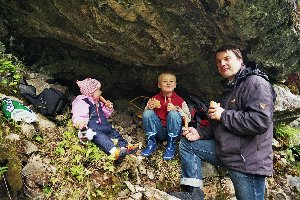 Wir wanderten durch die Wolken hindurch und kamen wegen ständiger Foto- und Filmstopps nur sehr langsam voran. Während für uns die Wanderung bei dem feuchten Wetter ziemlich anstrengend war, hatte es Lisa auf Papas Rücken warm und bequem und so dauerte es nicht lange, bis sie einschlief. Zwei andere Wanderer überholten uns auf den Serpentinen, weitere Leute schienen heute nicht unterwegs zu sein. Am Ende der Kehren wurde Vincent etwas quengelig, also legten wir eine Rast unter einem kleinen Felsüberhang ein. Von hier aus konnten wir einen der Tunnel mit Fenstern sowie ein Stück des weiteren Streckenverlaufes sehen. Während unseres Picknicks kamen zwei Leute den Weg herauf, die uns offenbar wegen der kleinen Kinder recht überrascht anschauten.