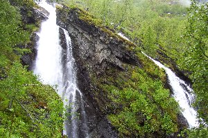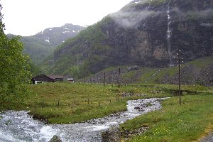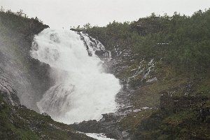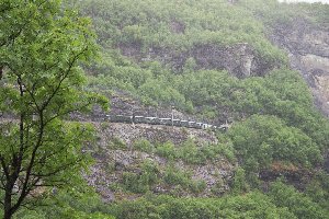 Punkt 11:00 Uhr setzte sich die Bahn in Bewegung und schlängelte sich entlang der steilen Trasse bergauf. Die beeindruckenden Ausblicke auf das Tal und unzählige Wasserfälle wurden immer wieder durch kürzere oder längere Tunnel unterbrochen und auch sonst nahm das Regenwetter vielen Panoramen den Reiz. Auf halber Strecke, bei Berekvam, gab es einen Halt, da nur hier die Strecke zweigleisig war und das Passieren des Zuges aus der Gegenrichtung ermöglichte. Ein weiterer fünfminütiger Stopp wurde am Kjosfossen, einem spektakulären Wasserfall direkt hinter einem Tunnel, gemacht. Hier gab es eine kurze musikalische Einlage, bei der eine Tänzerin am Wasser und auf der daneben stehenden Ruine umher wandelte.