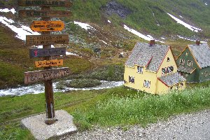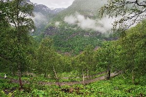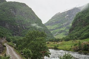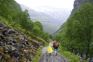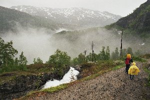 Durch einige weitere Tunnel, die zum Teil 360° durch den Berg führten und Fenster nach draußen hatten, gelangten wir schließlich zur Endstation. Gegen 12 Uhr hatten wir den Bahnhof von Myrdal erreicht, wo ein ziemliches Gedränge herrschte. Die meisten Fahrgäste blieben zur Rückfahrt im Zug sitzen, andere stiegen aus, um in die auf dem Nachbargleis wartende Bergenbahn umzusteigen. Wir setzten Lisa in ihre Trage, zogen die Regenjacken über und brachen gegen 12:15 Uhr zur Wanderung ins Tal auf.