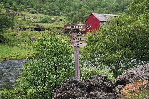 Gegen 15 Uhr erreichten wir schließlich die Schutzhütte am Haltepunkt Blomheller, wo bereits eine junge Radfahrerin saß und rastete. Nach einigen Minuten holte sie ein mehrsprachiges Informationsblatt über die Geschichte des Flåmtals aus dem Rucksack, befestigte dieses in der Hütte und radelte dann weiter. Wir warfen einen Blick auf den Fahrplan, einen weiteren auf die Uhr und sahen uns fragend an. Es war kurz nach 15 Uhr, um 15:09 Uhr sollte der nächste Zug zurück nach Flåm kommen. In Blomheller hält dieser jedoch nur, wenn man vorher das Zusteigen an diesem Punkt mit dem Zugbegleiter vereinbart hat. Sollten wir wirklich das Pech haben, dass uns der Zug hier stehen ließ und wir noch weitere 2,5 Kilometer bis Berekvam laufen müssten?