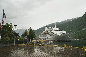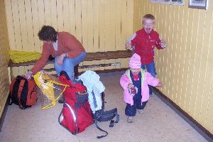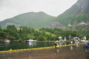 Als um 7:30 Uhr der Wecker die Nacht für uns endgültig beendete, war von Wetterbesserung leider keine Spur. Auf dem Weg zum Waschraum erkundigte sich Andreas an der Rezeption nach der aktuellen Prognose, diese versprach zwar nachlassende Schauer, erwies sich allerdings als äußerst schwammig… Also entwarfen wir während des Frühstücks einen Alternativplan, der ohne Fahrräder auskam und stattdessen unsere Regenkleidung sowie einmal mehr Lisas Tragekraxe ins Spiel brachte: Wir wollten den Zug nach Myrdal nehmen, dann so weit wie möglich das Tal hinab laufen und irgendwo auf dem Rückweg wieder in die Flåmbahn einsteigen. Gesagt - getan; während Doreen noch das Frühstücksgeschirr wegräumte und die Fotoausrüstung zusammenpackte, lief Andreas mit Vincent und Lisa bereits zum Bahnhof und tauschte dort die Einwegtickets inkl. Fahrradtransport gegen ein Familienticket für Hin- und Rückfahrt ein. Das klappte reibungslos und wir bekamen sogar noch 10 NOK heraus. Inzwischen kam Doreen mit Rucksack, Foto- und Videokamera nach und wir warfen noch einen flüchtigen Blick auf die heute am Kai liegende MS Discovery, bevor wir uns in die Schlange der auf die Abfahrt des Zuges Wartenden einreihten.