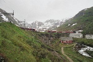 Es vergingen einige bange Minuten, dann hörten wir den Zug hupen und Andreas ging vor die Hütte, um auf uns aufmerksam zu machen. Zu unserer großen Überraschung kam der Zug jedoch nicht von Myrdal, sondern von Flåm. Da sich das einzige zweigleisige Stück in Berekvam befindet, bedeutete dies, dass in den nächsten Minuten kein Zug in der Gegenrichtung zu erwarten war. Irgendetwas stimmte offenbar mit dem Fahrplan nicht. Wie auch immer, der Zug hielt und der Zugbegleiter fragte, ob wir mitfahren wollten. Wir verneinten, meldeten aber unser Zusteigen für die Rückfahrt an.