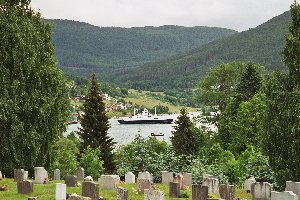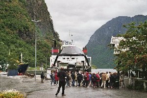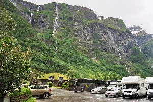 15. Tag: Flåm - Fjærland In dieser Nacht klangen die Niederschläge allmählich ab, aber eine wesentliche Verbesserung der Wetterlage war leider nicht in Sicht. Wir wollten heute mit der Fähre von Gudvangen durch den Nærøyfjord nach Kaupanger fahren. Laut unserem Reiseführer sollte man dafür in der Hauptsaison vorreservieren oder aber zeitig genug da sein, damit man auch mit kommt. Daher weckte Andreas um 7 Uhr die Kinder und nach einer kurzen Kuschelrunde im Alkoven standen wir auf und frühstückten. Während Doreen das Geschirr abwusch und die Sachen zusammen packte, schnallte Andreas die Räder wieder auf den Fahrradträger und um 9:30 Uhr waren wir abfahrbereit. Das war Rekordzeit in diesem Urlaub! Wir leerten noch unseren Abwassertank und füllten frisches Wasser auf, unterdessen ging Vincent rasch zum Zähneputzen in den Waschraum. Unser Timing hätte nicht besser sein können, denn als wir mit dem Wasser auffüllen fertig waren, warteten bereits zwei weitere Wohnmobile hinter uns. An der Rezeption bezahlten wir den Platz für die vergangenen zwei Nächte, dann verabschiedeten wir uns und fuhren los. Es ging zurück durch die langen Tunnel, die wir vorgestern bereits in der anderen Richtung passiert hatten. Obwohl wir früh dran waren, ließen wir den Abstecher zur Stabkirche nach Undredal erneut aus. Wir werden in den nächsten Tagen noch mehrere Gelegenheiten haben, andere Stabkirchen zu sehen. Der Platz auf der Fähre war uns im Moment einfach wichtiger. Um 10 Uhr erreichten wir die Anlegestelle in Gudvangen, unsere Fähre ging um 12 Uhr und wir waren das dritte Fahrzeug in der Reihe. Die Wartezeit überbrückten wir, indem wir die Tourbusse beobachteten, die Fahrgäste für die Fähre nach Flåm brachten.