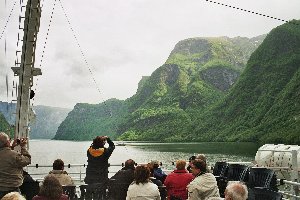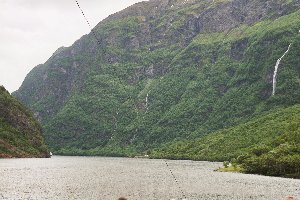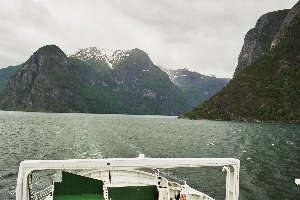 So verging die Zeit allmählich und uns kam der Gedanke, dass wir durch die Überfahrt heute keine Gelegenheit hätten, im Wohnmobil Mittagessen zu kochen. Als die Fähre gegen 11:40 Uhr anlegte, schmierte Doreen deshalb rasch noch einige Schnittchen und kochte ein paar Eier, die wir als Schnellimbiss verzehrten. Kurz darauf begann das Boarden und wir brachten gerade so die 760 NOK für die Überfahrt in Bar zusammen; Zahlung mit Karte war leider nicht möglich. Dann ging alles ganz schnell und während Andreas mit der Fotoausrüstung noch den Blick auf Gudvangen festhalten wollte, legte die Fähre bereits ab. Als er zurück zum Wohnmobil kam, war die Stimmung auch etwas gereizt, schließlich wollten Doreen und die Kinder auch etwas von der Landschaft sehen und nicht nur die Wände des Schiffsrumpfes. Wir zogen uns rasch die Jacken über und gingen dann hinauf auf das Oberdeck. Die Fahrt durch den schmalen Nærøyfjord war sehr beeindruckend. Die steilen, sehr hohen Felswände verstärkten den Eindruck der Enge oftmals noch und immer wieder konnte man eindrucksvolle Wasserfälle von der Abbruchkante herabstürzen sehen. Der Dauerregen hatte glücklicherweise aufgehört und zeitweise riss sogar die Wolkendecke auf und ein paar Sonnenstrahlen zauberten einen goldenen Glanz auf die Landschaft. Dann fuhren wir in den wesentlich breiteren Sognefjord ein, über den in spektakulärer Weise eine Hochspannungsleitung verlief. Zwischendurch ging Doreen mit der sehr müden Lisa für eine Weile zurück ins Wohnmobil, zum Ende der Überfahrt kamen die beiden aber wieder auf das Oberdeck, während Vincent in der Lounge darunter in seinem Micky-Maus-Heft las.