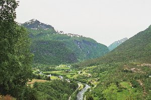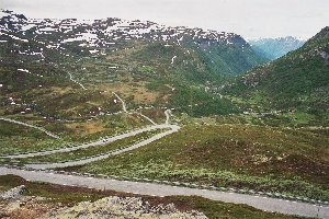 Den Abzweig nach Urnes zur dortigen Stabkirche ließen wir rechts liegen und folgten der Straße, die nun den Fjord verließ und sich spektakulär in engen Kehren den Berg hinauf bis auf 1400 m Höhe schraubte. Dabei gab es natürlich auch immer wieder Wasserfälle zu sehen und mehr als einmal hielten wir an, um das beeindruckende Panorama zu genießen. Kurz nach dem Höhenmarker 1100 m machten wir auf einem Parkplatz Mittagspause und bestaunten die umliegenden, bis zu 2400 m hohen, schneebedeckten Gipfel. Auch den bisherigen Verlauf der Serpentinenstraße konnte man von hier aus sehr gut sehen und wir wunderten uns, dass für diese Route bisher keine Maut fällig gewesen war.