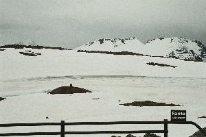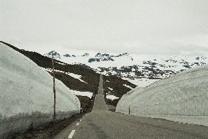 Nach dem Mittagessen und einer Tasse Kaffee fuhren wir weiter über den Sognefjellpass und erreichten den Jotunheimen Nasjonal Park. Hier oben auf dem Hochplateau des Sognefjellet lag zum Teil noch reichlich Schnee und in der Ferne konnten wir noch mehr schneebedeckte Gipfel emporragen sehen. Völlig verblüfft waren wir aber, als wir an gut besuchten Skiloipen vorbei fuhren. Damit hatten wir Mitte Juni überhaupt nicht gerechnet! Anschließend erwarteten uns weitere Serpentinen, die wieder talwärts führten.