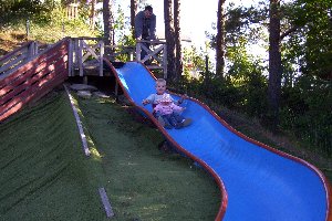 Im Moment war uns aber nicht nach weiterem Suchen zumute, wir wollten erst mal auf einen Zeltplatz und aufgrund des heute ausgefallenen Mittagessens ein frühes Abendbrot machen. Also liefen wir zurück zum Wohnmobil, blätterten im Reise- und dem ADAC-Campingplatzführer, die beide den Zeltplatz Dvergsnestangen-Senter empfahlen und beschlossen, diesen anzufahren. Die Fahrt dahin gestaltete sich als recht abenteuerlich, über Berg und Tal auf einspuriger Straße und zog sich scheinbar unendlich lange hin. Schließlich erreichten wir den Platz, der in wunderschöner Umgebung lag, ansonsten aber leider von vielen Dauercampern und Baustellen geprägt war. Wir ergatterten noch einen kleinen Stellplatz an der Straße und gingen dann mit den Kindern erst mal auf den sehr schönen, weitläufigen Spielplatz. Nachdem alle Rutschen durchprobiert und natürlich auch das Hopsefeld ausgiebig getestet worden war, gingen wir zum Abendbrot zurück zum Wohnmobil. Lisa fing beim Essen an zu bocken, wollte zuerst alles, aß letztlich aber fast gar nichts und war daraufhin die erste, die ins Bett ging. Vincent schaute noch eine Folge von „Thomas und seine Freunde“, während Andreas eine Dusche nahm – kalt, in Ermangelung eines entsprechenden Tokens, denn die Rezeption hatte inzwischen bereits geschossen.