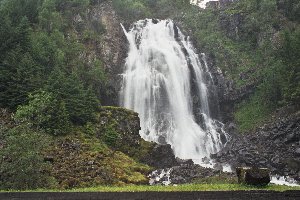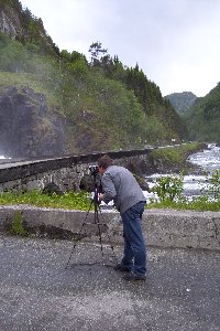 Anschließend fuhren wir weiter nach Jøsendal und zweigten dort auf die RV13 nach Odda ab. Die Fahrt ging entlang eines recht großen Baches und in der Ferne konnte man ab und zu schon erste Ausläufer des Folgefonn-Gletschers sehen. Wir blätterten bereits im Campingführer, um einen Platz für die Nacht herauszusuchen, als plötzlich ein Schild am Straßenrand den Latefoss ankündigte. Dieser gilt als einer der schönsten Wasserfälle Norwegens und wir hatten gar nicht mehr daran gedacht, dass er auf unserer heutigen Route lag. Kurz darauf tauchte linker Hand ein großer Wasserfall auf, dessen Gischt bis über die Straße zu unserem Wohnmobil wehte. Andreas packte die Foto- und Video-Ausrüstung aus und nutzte das dämmrige Licht für einige Langzeitbelichtungen mit dem Stativ. Da die Kinder zu quengeln begannen, fuhren wir rasch weiter, bis auf einmal der zweiarmige Latefoss rechts der Straße auftauchte. Da half kein Meckern und Lamentieren, wir machten nochmals einen kurzen Foto- und Videostopp.