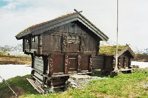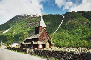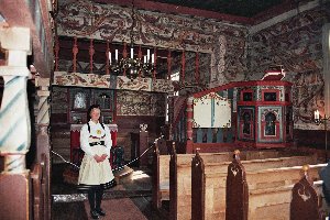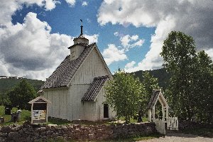 Den ersten Stopp legten wir in Bykle ein. Direkt an der Straße steht hier gegenüber dem modernen Kirchenneubau eine kleine weiße Holzkirche, die vor allem wegen ihrer Rosenmalereien im Inneren berühmt ist. Eine junge, in Tracht gekleidete Frau empfing hier die Besucher am Eingang und erzählte bereitwillig über die Geschichte der Kirche, des Ortes und seiner Bewohner.