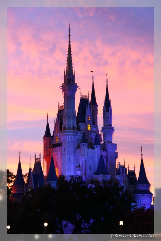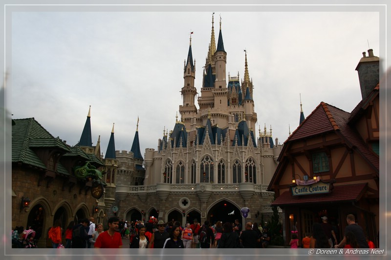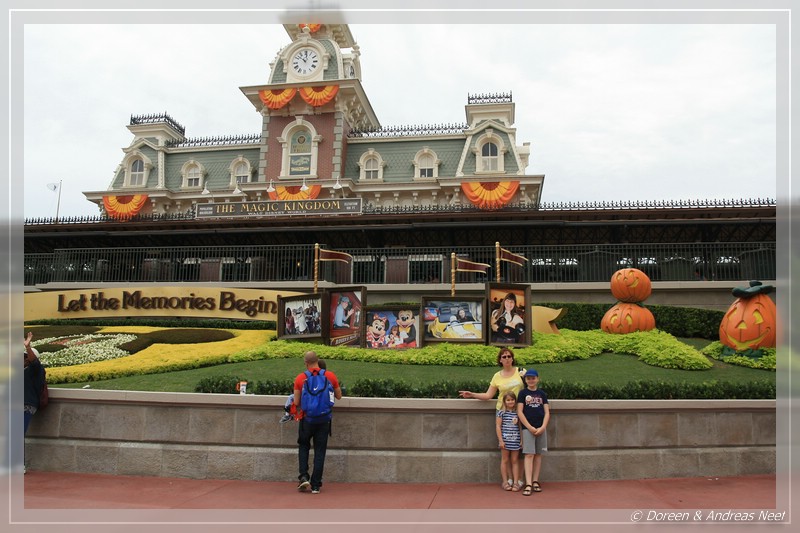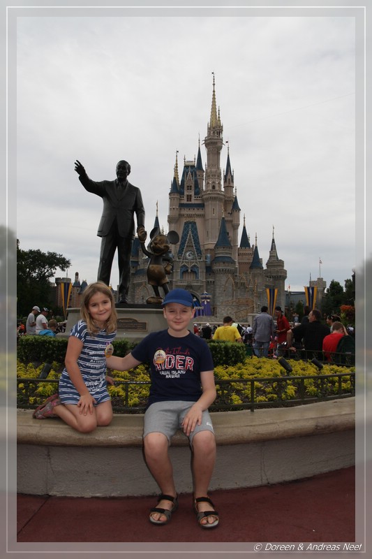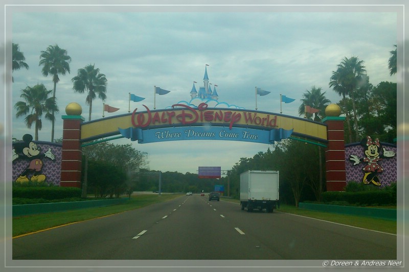 24.10.2013: Mit den Augen der Kinder... Allmählich fanden wir unseren Rhythmus in diesem Urlaub. Andreas wachte wie gewohnt als erster auf und setzte schon mal den Kaffee an. Kurz darauf krochen auch Lisa und Vincent aus den Betten und schließlich kam auch Doreen an den Frühstückstisch. Um 9:30 Uhr starteten wir in Richtung Orlando; heute hieß unser Ziel Disney World. Im Vorfeld unserer Reise hatten wir schon viel überlegt, ob wir diesen Ausflug überhaupt machen und wenn ja, welchen der vielen Themenparks wie besuchen sollten. Einen reinen Wasser- oder Film-Park wollten wir nicht besuchen, Zoo im weitesten Sinne sollte es auch nicht sein und mit der Future World und dem World Showcase im Epcot konnten unsere Kinder auch nicht so recht etwas anfangen. Blieb also das Magic Kingdom, was man wohl auch am ehesten mit der Welt von Walt Disney in Verbindung bringt und gewissermaßen den Ursprung von Disneyworld darstellt. Lisa wäre vom Cinderella-Schloss und den vielen Fahrgeschäften sicher auf jeden Fall begeistert und auch Vincent als Achterbahnmuffel würde vielleicht der einen oder anderen Attraktion etwas abgewinnen oder zumindest einmal einen Blick hinter die Kulissen seiner oft gelesenen Lustigen Taschenbücher werfen können. Wir waren ja während unserer ersten USA-Reise 1995 bereits im Disneyland in Anaheim und wussten daher in etwa, was uns erwarten würde... Über Vero Beach und den Florida Turnpike erreichten wir gegen 12 Uhr das Magic Kingdom. Offensichtlich hatten wir einen guten Tag ausgewählt; es war bedeckt bei nur etwa 19°C und an den Kassen herrschte kaum Andrang.