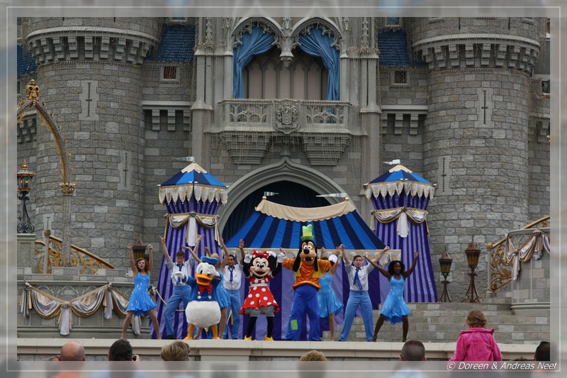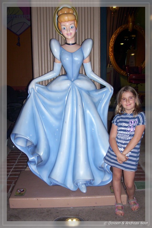 Na sowas. Aber gut, gegen die Langeweile ließ sich sicher etwas unternehmen. Also liefen wir weiter. Was die Kälte betraf, so war Lisa für das heutige Wetter vielleicht etwas zu luftig angezogen. Daher schauten wir uns in einigen Shops um, ob wir vielleicht eine leichte Jacke für sie fänden. Die Preise dort ließen uns diesen Gedanken aber ganz schnell wieder vergessen. Unsere Tochter jedoch fand Gefallen an den vielen schönen Prinzessinnen-Kleidern, die alle ganz genau so aussahen, wie in den entsprechenden Disney-Filmen. Schnell hatte sie vergessen, dass ihr gerade noch kalt war und wir konnten unseren Weg fortsetzen. Als wir am Cinderella Castle ankamen, fand auch dort gerade eine große Show statt, der unsere Kinder gebannt folgten.
