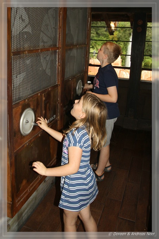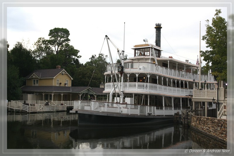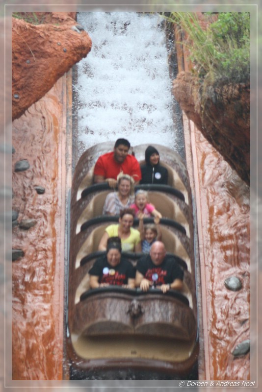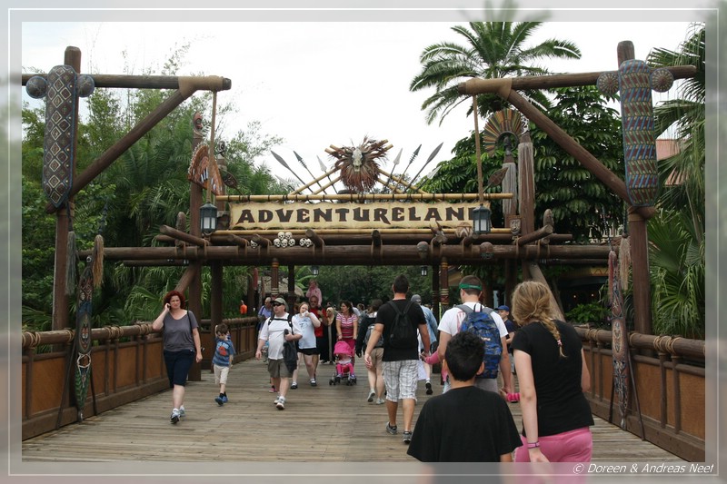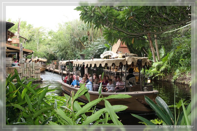 Also atmeten wir tief durch, versuchten uns wieder zu fassen und bummelten durch das wirklich toll gestaltete ´Pirates oft he Caribbean Dorf´. Als wir an der Tortuga Tavern ankamen, wurde uns bewusst, dass es bereits nach 14 Uhr war und wir seit dem Frühstück nichts gegessen hatten. Also betraten wir die urige Kneipe, wo uns aber schon wieder der Disney-Kommerz einholte. An einem großen Kassenbereich konnte man seine persönliche Auswahl an Fast Food ansagen und bezahlen. Gegen den Kassenbon bekam man die Speisen und Getränke dann weiter hinten an der Ausgabe. Die ausnahmslos adipösen Angestellten dort waren aber derart träge, dass sich schon stattliche Schlangen gebildet hatten, die bis in den Kassenbereich zurückreichten. Mit einem Wort: es war einfach nur Massenabfertigung. Wir wollten aber nicht noch mehr Zeit verlieren, also blieben wir in der Schlange stehen, bestellten zwei Kids-Burger-Meals sowie zwei Taco Salads für insgesamt 30$ und suchten uns dann einen freien Tisch. Wenigstens gab es auf die Salate und Getränke free Refills und so waren wir nach einer halben Stunde gesättigt und fit für die nächsten Unternehmungen. Wir liefen ein Stück zurück zur Ablegestelle der Jungle Cruise, einer Bootsfahrt durch den Dschungel, die sicher auch für unseren Sohn nicht zu wild war. Die am Eingang veranschlagten 30 Minuten Wartezeit erwiesen sich als ziemlich korrekt, auch wenn wir uns etwas über die Verfahrensweise am Einstieg geärgert haben: Zwei Leute aus der normalen Warteschlange, dann zehn Personen mit Fast-Pass. Die Fahrt an sich war dann ganz nett, auch wenn wir vom Gondwanaland im Leipziger Zoo vielleicht etwas verwöhnt waren, da gibt´s in etwa das Gleiche mit echten Tieren.
