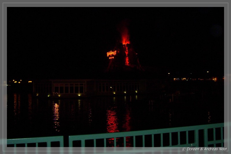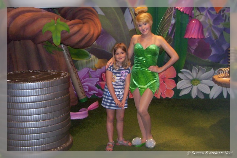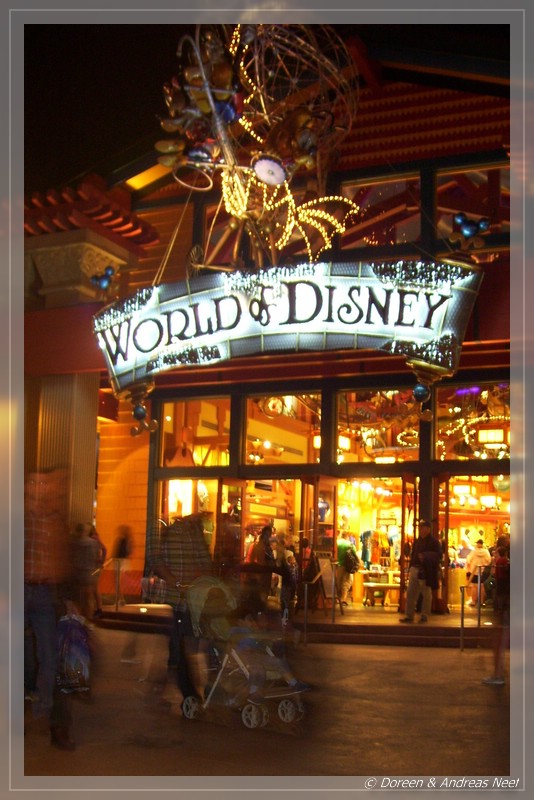 Im Eingangsbereich des Parks fanden wir noch zwei Coin-Automaten, wo sich Lisa und Vincent noch jeweils eine Souvenirmünze pressen konnten. Dann fuhren wir mit der Monorail zurück zum Parkplatz, fragten unser Navi nach einem Disney-Store und ließen und schnurstracks dort hin navigieren. Der erste Versuch endete zunächst vor der Schranke eines großen Hotelkomplexes. Der Posten dort sah aber die Durchfahrtlizenz für unser Resort in Fort Pierce hinter der Frontscheibe liegen, schaute offensichtlich nicht genau hin und ließ uns ohne weitere Fragen freundlich grüßend passieren. Na, da wollten wir natürlich nicht widersprechen und standen kurze Zeit später im Gift-Shop des Hotels. Dort gab es allerlei Nippes und Kleinigkeiten, nur leider nicht das gesuchte Kleid. Also fragten wir an de Kasse noch einmal nach und bekamen die Auskunft, dass wir nur mit dem Boot über den See oder mit dem Auto drumherum fahren müssten, schon wären wir in Downtown Disney. Also drehten wir noch einmal eine Ehrenrunde und fanden uns wenig später auf einem riesigen Parkplatz mit Blick auf eine riesige Glitzerwelt wieder. Vor uns lag eine rings um einen künstlichen See gruppierte Ansammlung von Hotels, Showbühnen, Restaurants und Shops, bunt beleuchtet und angestrahlt, wirkte fast wie ein Miniatur-Las-Vegas mit Disney-Flair. Wir bummelten entlang der Shoppingmeile am See, vorbei am T-Rex-Café, Rainforest-Café, Planet Hollywood etc. und da erinnerte sich Andreas, dass er erst kürzlich im Forum hierüber gelesen hatte. Uns gefiel, was wir sahen und wir tauchten ein in diese unwirkliche, aber ungemein unterhaltsame Fantasiewelt. Lisa und Vincent spielten eine Weile im LEGO-Store und kreierten dort ihre eigenen Legofiguren. Dann erinnerten wir uns irgendwann an unser eigentliches Anliegen und liefen weiter zur World of Disney, wo es wirklich alles gab, was irgendwie mit Disney zu tun hatte.