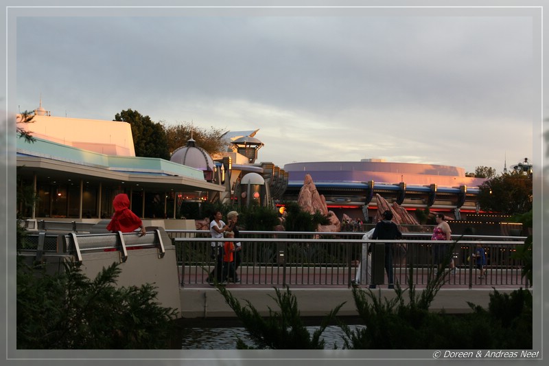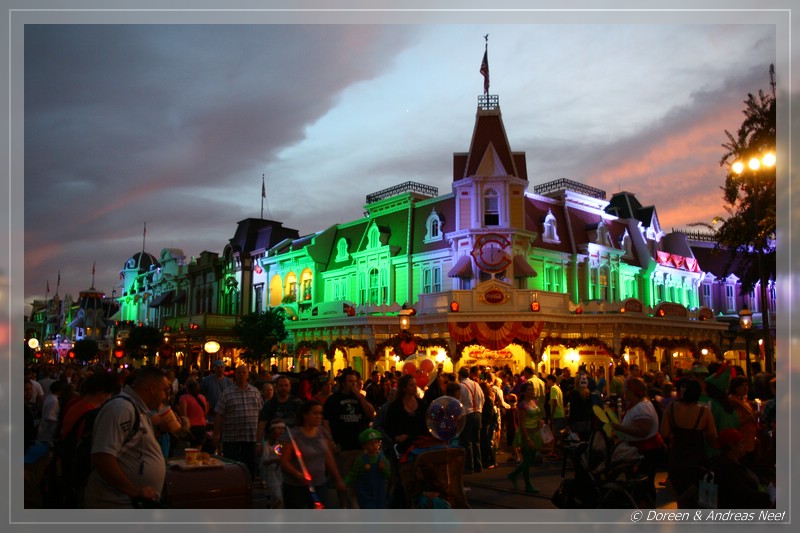 Als wir uns anschließend in Richtung Main Street bewegten, war dort schon alles für die große Halloween-Party geschmückt und abgesperrt. Ohne Extra-Ticket gab es nirgends mehr Zutritt und wir konnten nur noch ganz am Rande durch die uns entgegenströmende Menschenmenge in Richtung Ausgang laufen.